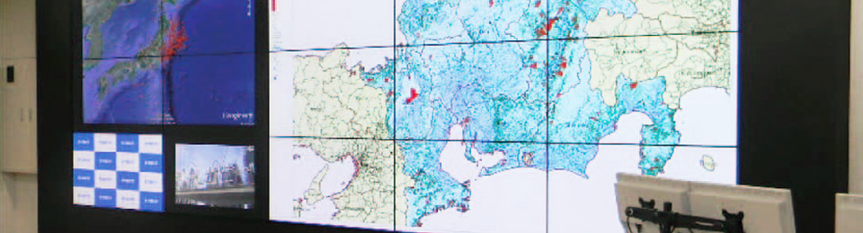 Digital Earth Room:A room equipped with multi-screen (large screen consisted of 15 displays (55in. Full-high vision) with 8 digital I/O and 16 analogue I/O) to support evidence-based deliberate discussion. Digital white board, multi-touch digital table, plotter, and 3D printer are installed as well. There are several HDMI/VGA terminals which are connected to the multi-screen. By using this terminals and multi-screen, four groups can share their information on the screen and have a discussion. Additionally, support services for setting up the maps with related spatial information, screen operation are also provided.